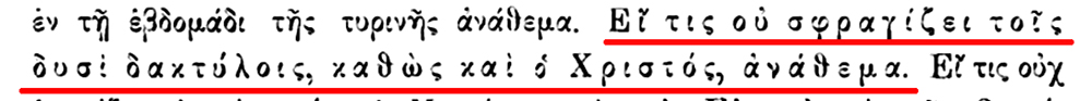 На греческом: "Εἴ τις οὐ σφραγίζει τοἳς δυσὶ δακτύλοις καθὼς καὶ ὁ Χριςτός, ἀνάθεμα" (А. А. Дмитриевский. Описание литургических рукописей, хранящихся в библиотеках Православного Востока. Tом 2: Euchologion, стр. 424).